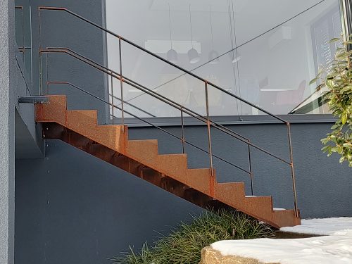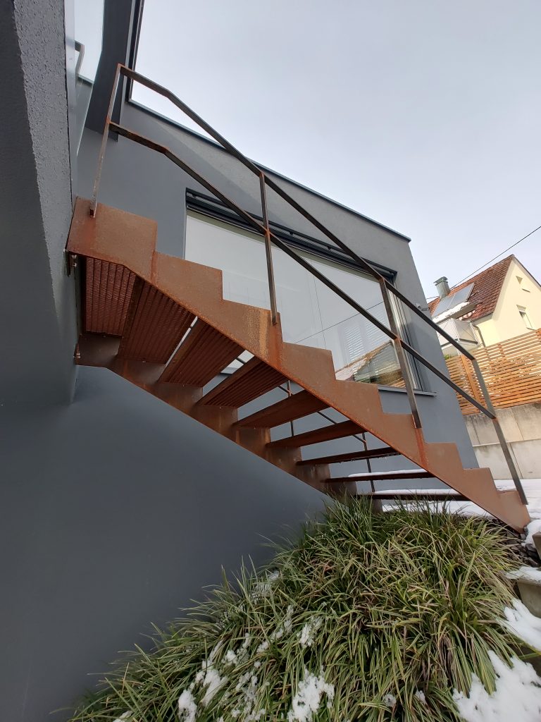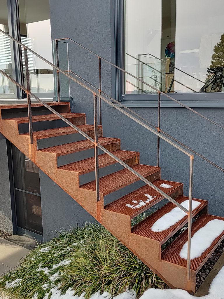 Aussentreppe mit Gitterroststufen aus Rohstahl mit Patina